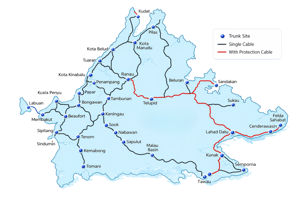• Approximately 12,000 km of fibre optic network deployed across Sabah and Labuan, strengthened through JENDELA and POP2 initiatives.